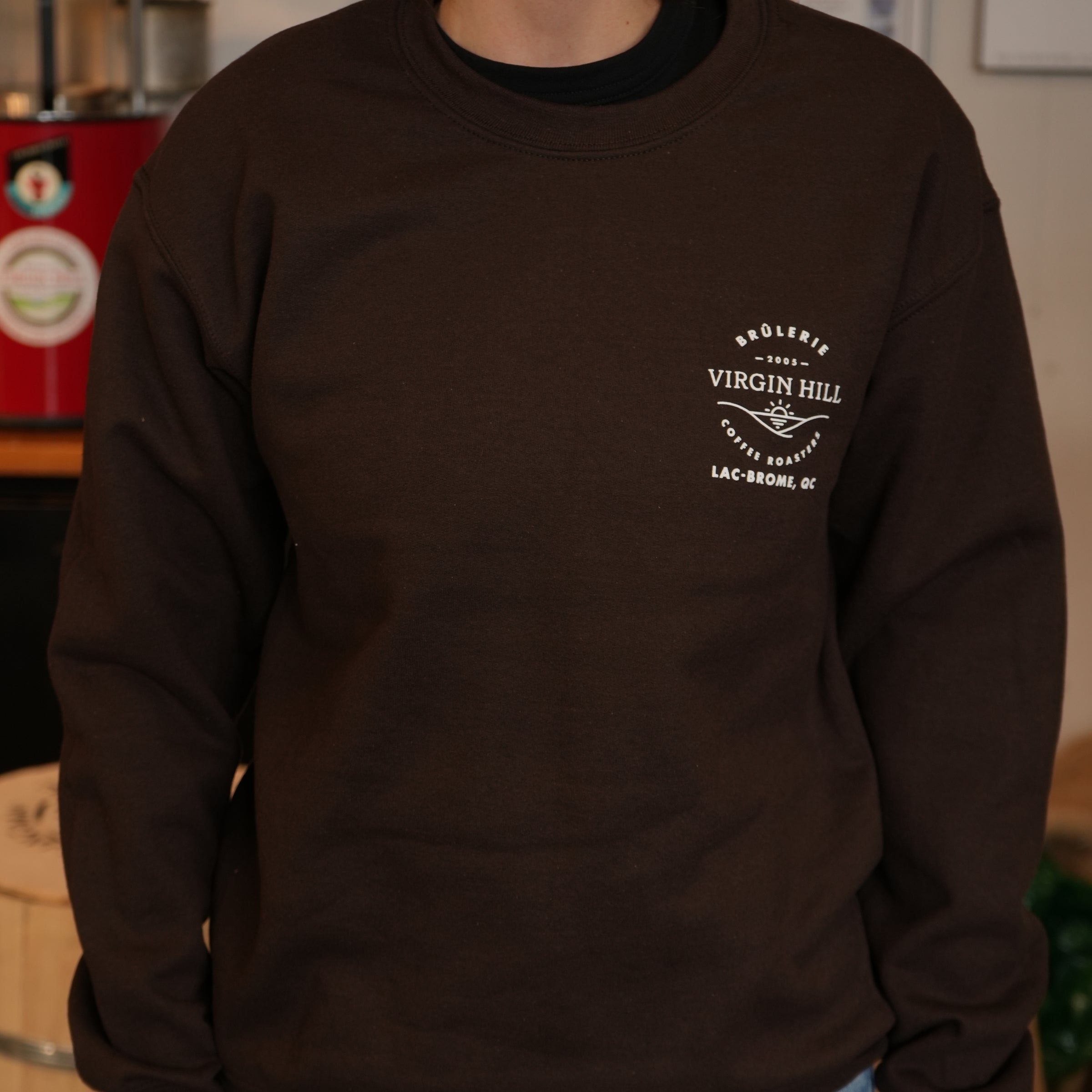 Our beautiful new brown "Je Capotccino" Virgin Hill logo crewneck sweaters will keep you warm this winter, while our coffee keeps your hands and hearts even warmer. With our now classic "Je capotccino" phrase appearing on the back, this sweater is a perfect fit for any spirited coffee lover. As for the front, you will be proudly showcasing our local roots in Lac-Brome, Qc. in the Eastern Townships.